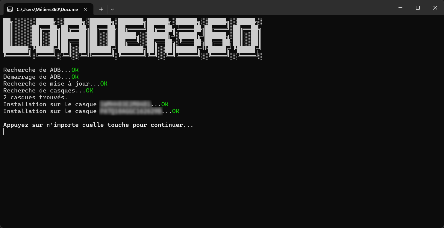 Dans certains cas - tout particulièrement pour les casques Meta - le loader ne permet pas de faire la mise à jour de l'application métiers 360 dans le casque.
